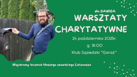 Klub Sąsiedzki GARAŻ zaprasza wszystkich do udziału w warsztatach charytatywnych, z których dochód zostanie przeznaczony na pomoc Dawidowi - naszemu osowskiemu listonoszowi, który walczy o zdrowie.